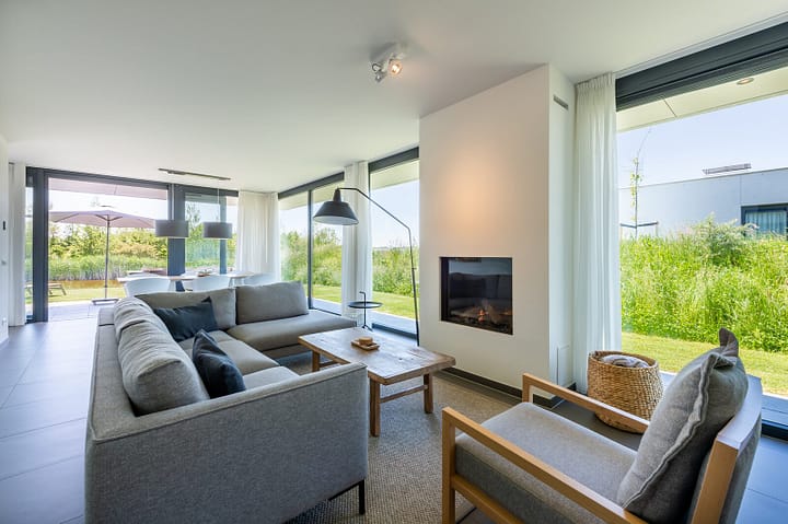 De sfeervolle woonkamer is heerlijk licht en door de glazen pui over de volle breedte van de living (floor to ceiling windows) kunt u genieten van het Zeeuwse licht. Door het openen van de tuindeuren verbindt u de woonkamer met het terras. In de living bevindt zich een comfortabele zithoek met sfeervolle gashaard en een flatscreen TV. Een grote eettafel nodigt uit tot gezellig tafelen.