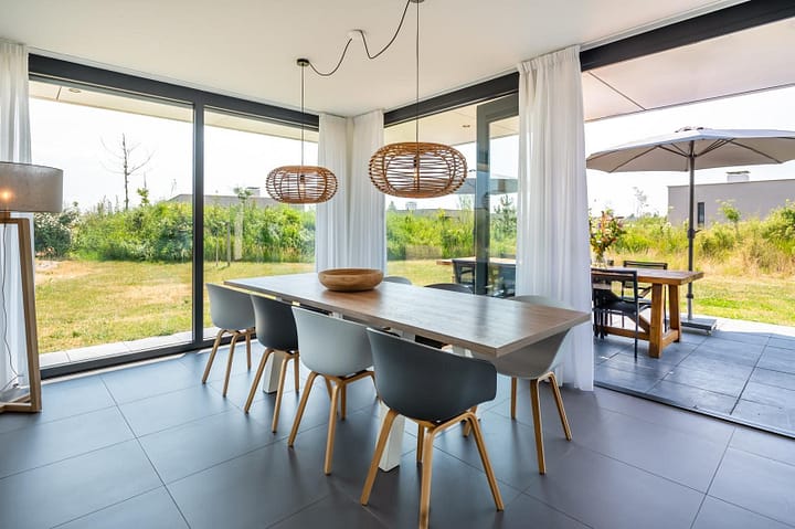 De sfeervolle woonkamer is heerlijk licht en door de glazen pui over de volle breedte van de living (floor to ceiling windows) kunt u genieten van het Zeeuwse licht. Door het openen van de tuindeuren verbindt u de woonkamer met het terras. In de living bevindt zich een comfortabele zithoek met sfeervolle gashaard en flatscreen TV. Een grote eettafel nodigt uit tot gezellig tafelen. De raampartijen zijn aan de buitenzijde voorzien van elektrisch bedienbare screens.