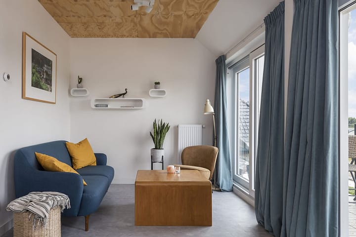Door de grote raampartijen, schuifpui en de vide geniet je in de woonkamer en leefkeuken van veel natuurlijk daglicht en een fijn uitzicht. De woonkamer heeft een gezellige zithoek, een zitje met televisie en een eethoek. De open keuken is uitgerust met een 4-pits gaskookplaat, oven, combimagnetron, koelkast met vriesvak, vaatwasser, Nespresso koffiezetapparaat, waterkoker en toaster.