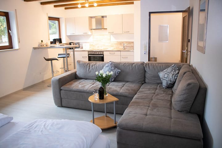 Een compleet gerenoveerde studio; ideaal voor een korte vakantie of lang weekend. De keuken, woonkamer en slaapkamer bevindt zich in één ruimte. Er staat een comfortabel boxspringbed en een slaapbank. De keuken is uitgerust en voorzien van alle gemak. De badkamer heeft een douche, wc en wastafel. Het balkon biedt een fantastisch uitzicht, waar het genieten is van de natuur. Een wasmachine en droger zijn beschikbaar.