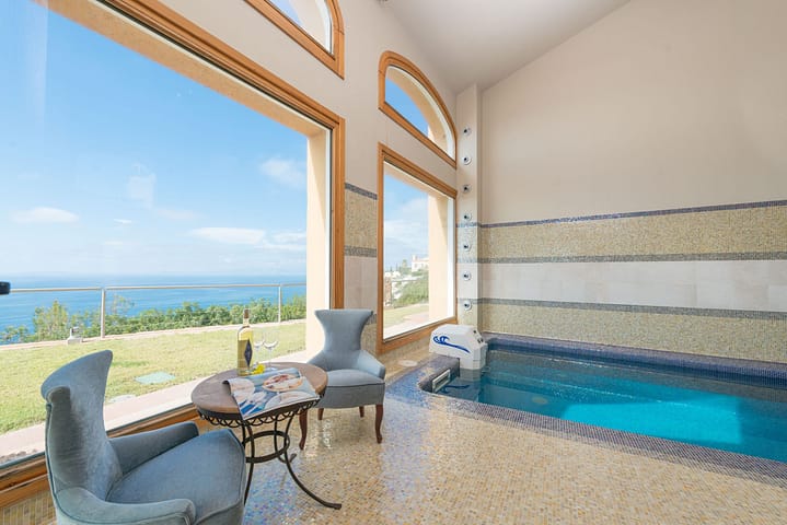 Het huis beschikt over 5 slaapkamers. Een slaapkamer met een tweepersoonsbed ligt op de begane grond met een eigen badkamer met een grote douche. De andere slaapkamers bevinden zich op de eerste verdieping. De tweede slaapkamer heeft een tweepersoonsbed en een moderne en-suite badkamer met douche. De andere twee slaapkamers zijn zeer ruim en hebben uitzicht dankzij hun grote ramen en hun directe toegang tot het balkon, elk voorzien van een moderne badkamer met douche. De vijfde slaapkamer is de meest luxueuze. Het heeft prachtig uitzicht en voorzieningen, een kleine lounge met twee fauteuils, kleedkamer, toegang tot een gemeubileerd terras en een spectaculaire en-suite badkamer met hydromassagedouche en whirlpoolbad, waar u het prachtige uitzicht kunt bewonderen dat dit spectaculaire huis biedt. Daarnaast zijn er 3 toiletten op de begane grond bedoeld voor het hele huis. Voor de kleintjes is er een kinderbedje en een kinderstoel beschikbaar om uw verblijf comfortabeler te maken.