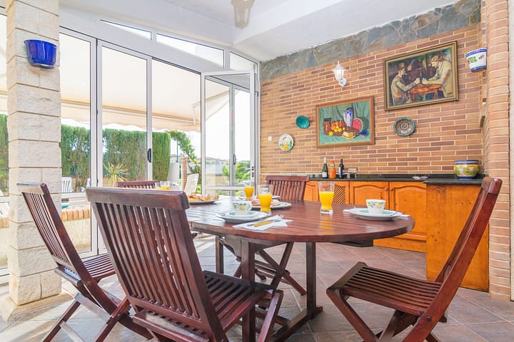 Binnen vindt u twee ruime woon-eetkamer, uitgerust met banken en tv om te genieten van een familie tijd (of met vrienden) of gewoon uitrusten. Een van hen staat open voor de keuken met een gasfornuis en alles wat u nodig heeft om te koken alsof u thuis bent. De wasmachine, strijkijzer en strijkplank zijn ook hier. Een douche badkamer completeert deze verdieping. Op de eerste verdieping hebben we de drie slaapkamers, allemaal met een kast. Een heeft een tweepersoonsbed en een eigen badkamer met een bad, evenals ruimte voor een babybedje (en een kinderstoel is ook beschikbaar). De andere twee kamers hebben twee eenpersoonsbedden. Een tweede badkamer met een bad maakt deze verdieping compleet. De kelder beschikt over een prachtige fitnessruimte en een sauna, zodat u ook tijdens uw vakantie kunt trainen. Het huis heeft air-conditioning in alle kamers en ook centrale verwarming op gas.