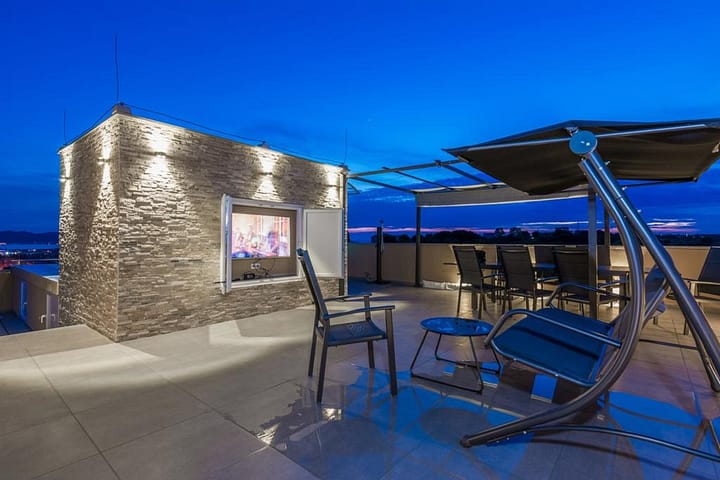 Deze unieke, moderne en adembenemende villa met panoramisch uitzicht is gelegen in Zadar, 2,6 km van het oude stadscentrum. Het is omgeven met ontspannende bezienswaardigheden op de berg Velebit, de Adriatische zee en eilanden. Vredige en rustige omgeving geeft u totale privacy, en toch bent u dicht bij het stadscentrum als u iets nieuws wilt ontdekken.
