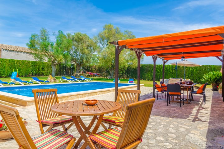 Geniet van een onvergetelijke Mallorcaanse zomer in dit landgoed daterend uit de 19e eeuw! De goed onderhouden buitenkant heeft een eigen 5mx 10m chloorbad met een diepte van 1,35m tot 2,1m. Trouwens, er is een buitendouche als je zin hebt om te douchen voor en na het zwemmen in het zwembad. Het zwembad is omgeven door een tuin met acht ligstoelen en een leuk terras met parasol. Er is een barbecue als je zin hebt in koken – verras je geliefden met lekker vlees en gegrilde groenten! Daag vrienden en familie uit aan de tafeltennistafel terwijl kinderen genieten van de speeltuin in de tuin. Het perceel is omheind en er zijn geen directe buren, dus u zult genieten van privacy. Dit huis biedt een tweede huis op 300m2 en twee verdiepingen. Binnen, elegante gemakken combineren traditionele decoratie, zoals met stenen omzoomde muren en houten balken. Er is een mooie woonkamer met TV-SAT en CD-speler. De kokette keuken is goed uitgerust met een gasfornuis, een elektrische oven en kookgerei. Het eetgedeelte staat open voor de keuken; bestaande uit een ruime tafel waar tien mensen samen kunnen eten. Er is een slaapkamer met een tweepersoonsbed, een kledingkast, een ventilator en een badkamer met een bad en een toilet op de begane grond. De wasmachine, strijkijzer en strijkplank bevinden zich in een van de badkamers. Er is een woonkamer met twee individuele slaapbanken (90 x 190 cm), drie slaapkamers (twee met twee eenpersoonsbedden en een met een tweepersoonsbed) en een badkamer met ligbad op de eerste verdieping. Alle drie de slaapkamers zijn voorzien van een ventilator en een kledingkast en zijn op een gezellige en traditionele manier ingericht. Vilafranca de Bonany is een rustig dorp in het centrum van het eiland, waar je het lokale leven van binnenuit, tussen de lokale bevolking kunt leren kennen. Er is een kleine supermarkt voor uw basisbehoeften, en in Manacor of Sineu vindt u alle andere diensten, zoals grotere supermarkten, winkels of restaurants. Het dorp is gemakkelijk verbonden met andere plaatsen, zoals Palma, met zijn musea, kunstgalerijen en restaurants, Cala Millor met zijn enorme toeristische aanbod en Cales de Mallorca met zijn prachtige kleine baaien. Tussen Vilafranca en Petra vindt u de kleine heuvel Bonany, met een mooie haven en een spectaculair uitzicht over bijna het hele eiland. Huisdieren zijn niet toegestaan. Viering van evenementen en feesten is niet toegestaan. Neem contact op met de adverteerder voor mogelijke extra kosten. Er is een externe parkeerplaats voor 3 auto’s. Afstanden Strand: 23,3 km – Plata des Port, Porto Cristo Luchthaven: 41,8 km – Son Sant Joan, Palma Golfbaan: 13,9 km – La Reserva Rotana, Manacor Dorp: 5 km – Vilafranca Treinstation: 9,4 km – Pl de l’Estació , Manacor Bushalte: 5,2 km – Crta de Palma, Vilafranca de Bonany Ferry: 36,8 km – Port d’Alcúdia Ziekenhuis: 10,4 km – Hospital de Manacor Toeristenkaart: 1000 / ET U ontvangt 7 dagen voor aankomst een e-mail met een verplichte betaling algemene aanbetalingsinformatie. De aanbetaling dient binnen 24 uur na ontvangst van de e-mail met een creditcard via een beveiligde link te worden voldaan. Neem voor meer informatie contact op met het kantoor via de informatie in de reserveringsbevestiging die u na het boeken ontvangt.