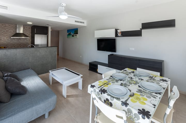 Het appartement bevindt zich op de tweede verdieping van een gebouw met een lift. Het heeft een behulpzaam ontwerp en een moderne inrichting. Als u binnenkomt, vindt u een ruime woon-eetkamer-keuken waar u uw beste recepten op het keramische blad kunt bereiden terwijl u tv kijkt, de tafel opzet of samen chat. De wasmachine, strijkijzer en strijkplank zijn ook hier. Het appartement beschikt over twee slaapkamers om te rusten, beide met een kledingkast. De ene heeft een tweepersoonsbed en de andere heeft twee eenpersoonsbedden. De extra gast slaapt op de slaapbank in de woonkamer. We kunnen een kinderbedje en een kinderstoel klaarmaken voor als u met uw baby reist. Drie ventilatoren en drie radiatoren maken het apparaat compleet.