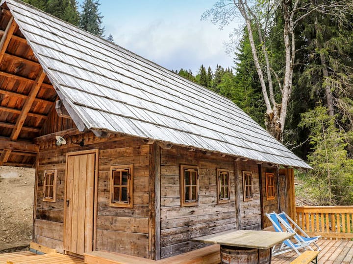 “Panoramahütte”, chalet 2-kamers 50 m2 op 2 verdiepingen. Het objekt is geschikt voor 2 volwassenen + 1 kinderen. Romantisch en met veel hout ingericht: woon-/slaapkamer met 1 divanbed (90 cm, lengte 190 cm), eethoek. Kleine, open keuken (1 inductiekookplaten, magnetron, elektrische koffiemachine, pads voor de koffiemachine (Nespresso) extra). Douche, aparte WC, hydromassage douche. Elektrische verwarming. Bovenverdieping: (steile trap) open slaapnis met afgeschuinde daken met 1 2-pers bed (160 cm, lengte 200 cm). Groot terras gedeeltelijk overdekt. Terrasmeubelen, ligstoelen (2). Zeer mooi uitzicht op de bergen en het landschap. Ter beschikking: Internet (Internet (WiFi), gratis). Let op: rookvrij huis. 1 huisdier/hond toegestaan. Als er minder dan het maximale aantal gasten in de accommodatie verblijft, zijn niet alle wooneenheden beschikbaar voor gebruik.