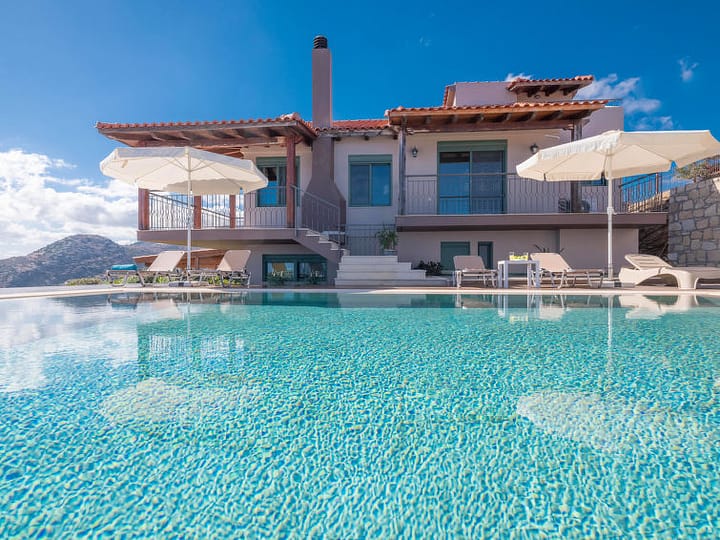 “Eolos”, villa 6-kamers 200 m2 op 2 verdiepingen. Ruim en licht, zeer mooi en stijlvol ingericht: open woon-/eetkamer met open haard en Sat-TV (Flatscreen TV). Uitgang naar het balkon. 1 2-pers. kamer met 1 2-pers bed en bad/WC. Uitgang naar het balkon. 1 2-pers. kamer met 1 2-pers divanbed. Uitgang naar het balkon. Vide met 1 2-pers bed. Uitgang naar het balkon. Keuken (4-pits kookplaat, oven, afwasmachine, magnetron, elektrische koffiemachine). Uitgang naar het balkon. Aparte WC. Air-conditioning. Souterrain: 1 2-pers. kamer met 1 2-pers bed. Groot speelkamer met 1 divanbed. Douche/WC. Air-conditioning. 4 balkons, zithoek in de tuin. Balkonmeubilair. Mooi panoramazicht op zee en de baai. Ter beschikking: wasmachine, kluis, strijkijzer, haardroger. Internet (Internet (WiFi), gratis). Geschikt voor families.