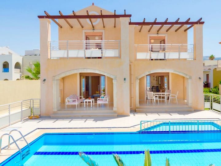 “Avra”, villa 8-kamers 400 m2 op 3 verdiepingen. Ruim en licht, mooi ingericht: open woon-/eetkamer met Sat-TV (Flatscreen TV). Uitgang naar de tuin, naar het balkon, naar het zwembad. 1 2-pers. kamer met 1 2-pers bed en douche/WC. Uitgang naar het zwembad. Keuken (afwasmachine, 4 keramische glas kookplaten, magnetron, elektrische koffiemachine) met eettafel. Uitgang naar de zitplaats in de tuin. Douche/WC. Air-conditioning. Souterrain: (ladder) speelkamer. 1 2-pers. kamer met 2 bedden en douche/WC. Air-conditioning. Bovenverdieping: (ladder), 2 2-pers. kamers, elke kamer heeft 1 2-pers bed en Sat-TV. Uitgang naar het balkon. 2 2-pers. kamers, elke kamer heeft 2 bedden. Uitgang naar het balkon. 2 bad/douche/WC’s. Air-conditioning. Groot terras. Terrasmeubelen, barbecue. Mooi, op zee en het zwembad. Ter beschikking: wasmachine, haardroger. Internet (Internet (WiFi), gratis). Geschikt voor families. 1041K123K2558101