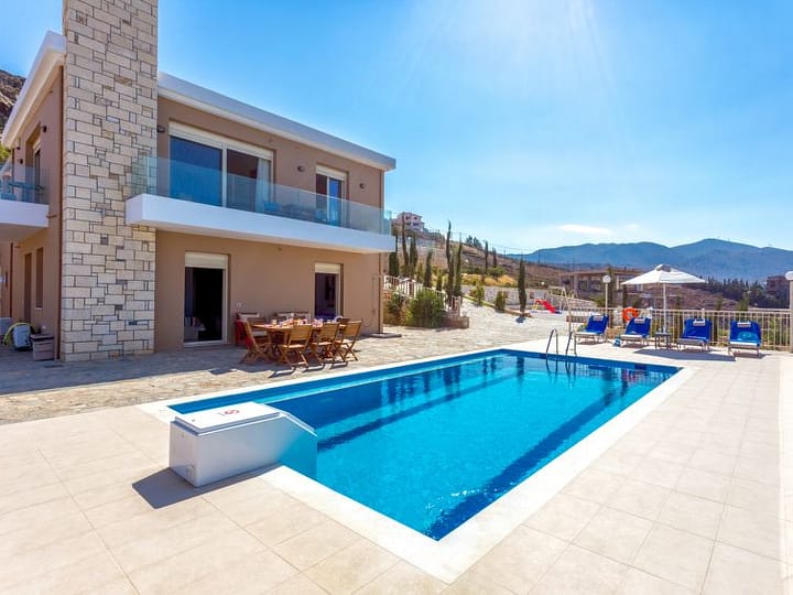 “Rami”, villa 5-kamers op 2 verdiepingen. Ruim en licht, zeer mooi en stijlvol ingericht: woon-/eetkamer met panoramavenster met open haard, eettafel, Sat-TV, Flatscreen TV, CD-speler, DVD en air-conditioning. Uitgang naar het balkon. Keuken (4-pits kookplaat, oven, afwasmachine, magnetron, diepvriezer, elektrische koffiemachine, steamer) met eettafel. Souterrain: 1 groot 2-pers. kamer met 1 2-pers bed, bad en air-conditioning. Uitgang naar de zitplaats in de tuin, naar het zwembad. 1 2-pers. kamer met 1 2-pers bed en air-conditioning. Uitgang naar de zitplaats in de tuin, naar het zwembad. 2 2-pers. kamers, elke kamer heeft 2 bedden en air-conditioning. Uitgang naar de zitplaats in de tuin. Badkamer, bad/douche/bidet/WC. Elektrische verwarming. Balkon, zithoek in de tuin, tuin. Terrasmeubelen, balkonmeubilair, barbecue, ligstoelen. Mooi panoramazicht op zee, de bergen, het zwembad, de tuin en het landschap. Ter beschikking: wasmachine, strijkijzer, kinderstoel, kinderbed, haardroger. Internet (Internet (WiFi)). Parkeerplaats, parkeerplaats. Geschikt voor families. 1039Κ91003214301