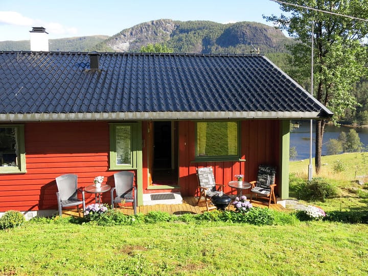 “Trollevika (FJS554)”, huis 5-kamers 150 m2 op 2 verdiepingen. Het objekt is geschikt voor 5 volwassenen + 3 kinderen. Gezellig ingericht: woon-/eetkamer met zwedenkachel, eettafel, Sat-TV en internationale TV-zenders. Uitgang naar het terras. 1 kamer met 1 2-pers bed (150 cm, lengte 200 cm). 1 kamer met 1 2-pers bed (120 cm, lengte 200 cm). 1 kamer met 1 bed (75 cm, lengte 200 cm). Open keuken (oven, afwasmachine, 4 keramische glas kookplaten, broodrooster, waterkoker, magnetron, diepvriezer, elektrische koffiemachine). Douche/WC. Bovenverdieping: 1 kamer met 1 x 2 stapelbedden (120 cm, lengte 200 cm). Aparte WC. Elektrische verwarming, vloerverwarming. Houten vloeren. Terras gedeeltelijk overdekt. Terrasmeubelen, barbecue, bergruimte. Uitzicht op de rivier. Ter beschikking: wasmachine, kinderstoel, kinderbed. Internet (Internet (WiFi), gratis). Let op: niet rokers woning. Rookmelders, brandblusser.