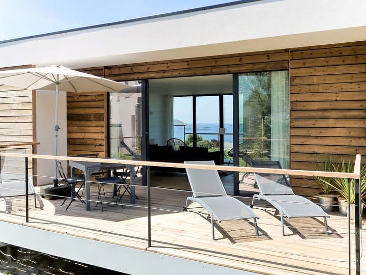 “Ty Sables (LOQ220)”, huis 4-kamers 120 m2. Comfortabel en modern ingericht: woon-/eetkamer met eettafel en TV. Uitgang naar het terras. 1 kamer met 1 2-pers bed (160 cm), douche en dubbele wastafels. Uitgang naar het terras. 1 kamer met 1 2-pers bed. Uitgang naar het terras. 1 kamer met 2 bedden (80 cm). Uitgang naar het terras. Berging. Open keuken (oven, afwasmachine, 3 inductiekookplaten, broodrooster, waterkoker, magnetron, elektrische koffiemachine). Douche, 2 aparte WC’s, dubbele wastafels. Elektrische verwarming. Parketvloeren. 2 terrassen. Terrasmeubelen, barbecue (verrijdbaar), ligstoelen (2), zitgelegenheid. Mooi panoramazicht op zee. Ter beschikking: wasmachine, kinderstoel, kinderbed. Internet (Internet (WiFi), gratis). Let op: rookvrij huis. 1 huisdier/hond toegestaan. Rookmelders.