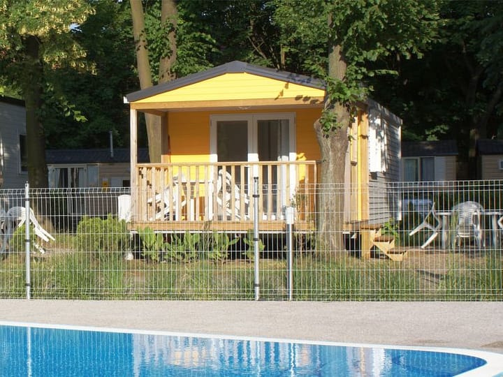 “Sunset Terrace”, 3-kamers mobilhome 32 m2. Woonkamer met eettafel. 1 kamer met 1 2-pers bed. 1 kamer met 2 bedden. Keuken (4 kookpitten (vlammen), magnetron, diepvriezer, elektrische koffiemachine). Douche, aparte WC. Elektrische verwarming. Terras. Terrasmeubelen. Ter beschikking: Internet (Internet (WiFi), gratis). Maximaal 1 huisdier/hond toegestaan.