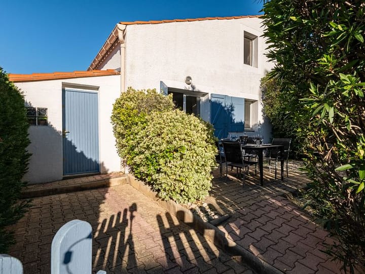 Huis in een rij 2-kamers 40 m2 op 2 verdiepingen. Doelmatig ingericht: woon-/eetkamer met eettafel en TV. Uitgang naar het terras. 1 kamer met 1 x 2 stapelbedden (90 cm, lengte 190 cm). Kookhoek (2-pits kookplaat, mini-oven, oven, afwasmachine). Douche/WC. Bovenverdieping: 1 open kamer met 1 2-pers bed (1 x 140 cm, lengte 190 cm), TV. Terras 20 m2. Terrasmeubelen, elektrische barbecue (verrijdbaar). Ter beschikking: wasmachine. Parkeerplaats bij het huis.