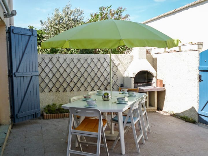 Huis in een rij 3-kamers 50 m2 op 2 verdiepingen. Woon-/eetkamer met 1 divanbed, TV en DVD. Uitgang naar het terras. Kookhoek (4-pits kookplaat, oven, afwasmachine, magnetron). Bovenverdieping: 1 kamer met 1 2-pers bed (1 x 140 cm). 1 kamer met 1 x 2 stapelbedden (80 cm). Douche, aparte WC. Terras 25 m2, op het oosten gelegen. Terrasmeubelen, barbecue. Ter beschikking: wasmachine. Internet (Internet (WiFi), extra). Parkeerplaats. Let op: maximaal 1 huisdier/hond toegestaan. Rookmelders.