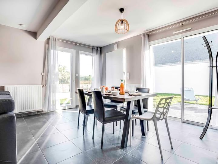 Huis 4-kamers 100 m2 op 2 verdiepingen. Comfortabel en mooi ingericht: woon-/eetkamer met TV (Flatscreen TV). Uitgang naar het terras. 1 kamer met 1 2-pers bed (1 x 160 cm, lengte 190 cm), douche/WC. Uitgang naar het terras. Open keuken (oven, afwasmachine, 3 inductiekookplaten, magnetron, diepvriezer, elektrische koffiemachine, pads voor de koffiemachine (nespresso) extra). Aparte WC. Bovenverdieping: 2 kamers met afgeschuinde daken, elke kamer heeft 1 2-pers bed (1 x 140 cm, lengte 190 cm). Douche/WC. Terrasmeubelen. Ter beschikking: wasmachine. Internet (Internet (WiFi), gratis). Let op: 1 klein huisdier/hond toegestaan. Rookmelders.