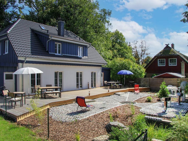 “Boddenruhe & Boddenrauschen”, huis 6-kamers 150 m2 op 3 verdiepingen. Licht, smaakvol ingericht: woon-/slaapkamer met 1 2-pers divanbed, zwedenkachel, eettafel, Sat-TV, radio, CD-speler en DVD. Uitgang naar het terras. Woon-/eetkamer met zwedenkachel, eettafel, kookhoek, Sat-TV, radio, CD-speler en DVD. Uitgang naar het terras. Open keuken (oven, afwasmachine, 4 keramische glas kookplaten, broodrooster, waterkoker, grill, elektrische koffiemachine) met eettafel. 2 douche/WC’s. Bovenverdieping: woonkamer met afgeschuinde daken met Sat-TV. Woon-/slaapkamer met afgeschuinde daken met 1 2-pers divanbed en Sat-TV. 2 2-pers. kamers met afgeschuinde daken. 2 douche/WC’s, dubbele wastafels. Vloerverwarming. Zolderverdieping: 2 kamers met afgeschuinde daken, hoogte van het plafond 80 – 180 cm, elke kamer heeft 1 bed. Groot terras. Terrasmeubelen, barbecue. Ter beschikking: wasmachine, droger, kluis, strijkijzer, kinderstoel, kinderbed. Internet (Internet (WiFi), gratis). Parkeerplaats (4 Auto’s), parkeerplaats (4 Auto’s). Let op: rookvrij huis. Rookmelders, brandblusser. Geen interne verbinding tussen de aparte wooneenheden.