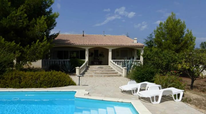 Schitterende mediterrane villa met overdekt terras, groot privé zwembad en apart kinderbad. Het zwembad is bijverwarmd met zonnecollectoren en de veranda is voorzien van buitenverwarming voor de koelere avonden. Dit maakt deze villa zeer geschikt voor alle seizoenen! Met volledige privacy, gelegen in het groen aan een rustig weggetje op loopafstand van het dorp voor vers brood en een krantje uit de Minimarkt. Prachtige villa met ruime living (50m2), hoog balkenplafond en schuifpui naar groot overdekt terras (40m2) gericht op het zuiden met meubilair, stenen barbecue en toegang tot ruime achtertuin met privé zwembad. Comfortabel ingericht, sfeervolle verlichting en compleet toegeruste moderne open keuken. Er zijn 3 slaapkamers met hang-legkast, waarvan één met toegang tot het overdekte terras. Twee slaapkamers hebben eenpersoons bedden (80×200) en één slaapkamer heeft een twee persoonsbed (180×200). Er zijn twee badkamers, één grote met ligbad, douchecabine, dubbele wastafel en toilet. De tweede badkamer met toilet, wastafel en douche. Er is een aparte bijkeuken met wasmachine, droger en tweede koelkast. De airco hangt in de centrale hal, er is vloerverwarming op gas en een houtkachel. De villa heeft horren voor de ramen. De villa bevindt zich midden op een groot perceel van 2400m2 met mediterrane beplanting Het mooie, grote zwembad (5x10m)heeft een makkelijke Romeinse inlooptrap. De omliggende terrassen bieden optimale privacy en zijn voorzien van ligstoelen met kussens, zitjes en parasols. Het kinderbad is 3 x 3m en 40 cm diep. Het water is verwarmd met zonnecollectoren, waardoor het mogelijk is om ook buiten het seizoen langer van het zwembad te genieten (als er geen of minder zon is, werkt deze zonneverwarming uiteraard niet!). De stenen BBQ en de mooie tuin- en zwembadverlichting nodigen uit tot lang nazitten op de veranda. Deze is tevens voorzien van een elektrische straalverwarming, heerlijk voor de koelere avonden. . Er is een ruime carport waar U uw auto in de schaduw kunt parkeren.