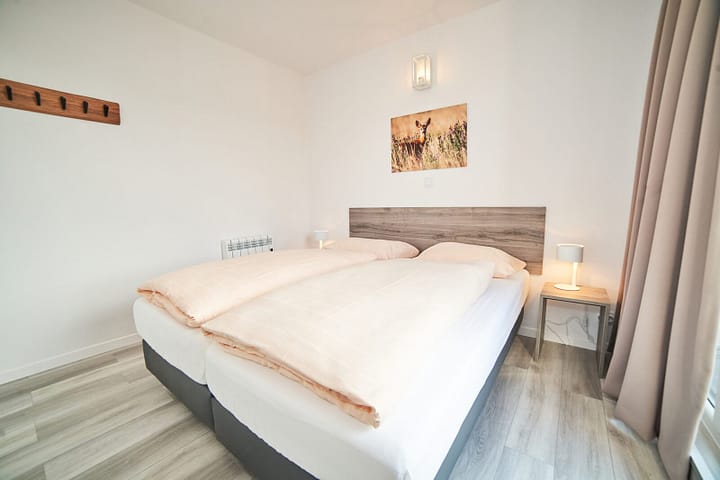 Deze volledig ingerichte bungalow is geschikt voor maximaal 6 personen. De bungalow beschikt over een woonkamer met open keuken. De woonkamer is voorzien van apparatuur zoals een flat screen tv. De open keuken is voorzien van een kookplaat, koelkast met vriesvak, koffiezetapparaat, magnetron en waterkoker. Er zijn drie slaapkamers waarvan twee slaapkamers met twee éénpersoonsbedden, één slaapkamer met een stapelbed. De badkamer is voorzien van een douche en toilet. Buiten op het terras heeft u de beschikking over tuinmeubilair.