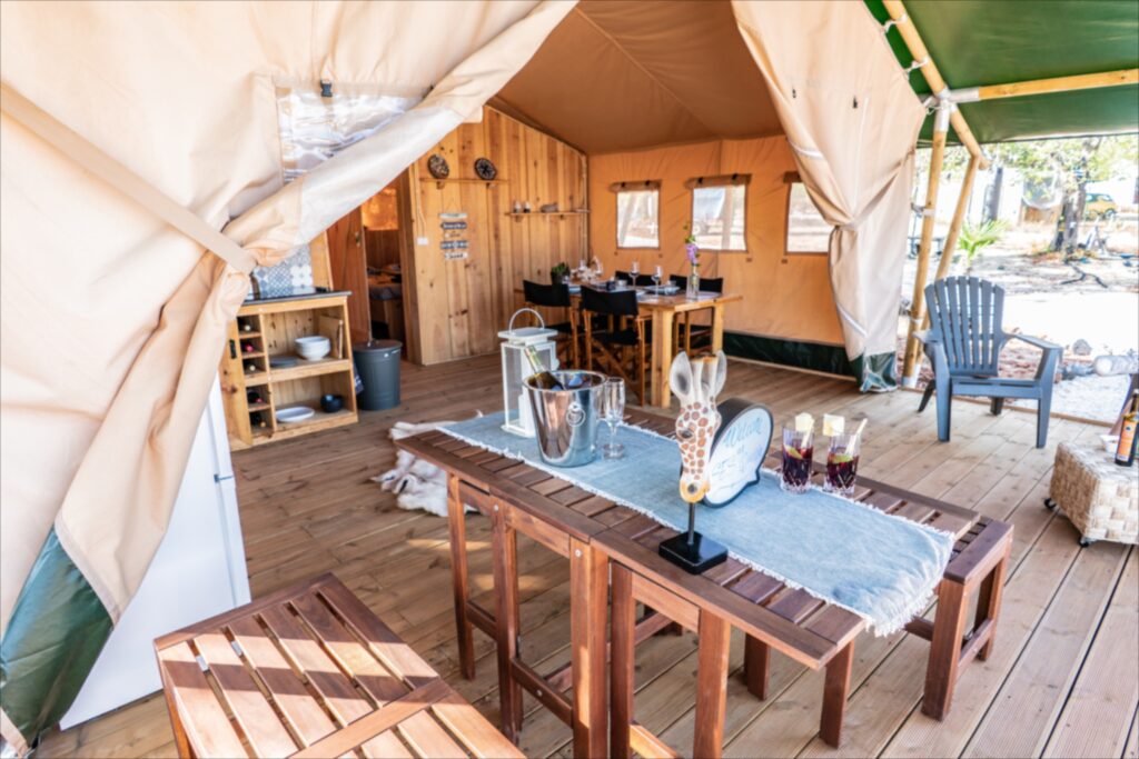 Ses Quinta is located in the beautiful Algarve. From Paderne it is a 20 min. drive to the coast, and to Albufeira for example.The tents are in our spacious garden with Alfarobe, olive, orange, apple, cherry, lemon, almond and fig trees. Both tents have a private swimming pool with a luxurious deck, directly accessible from the tent. The tents have a fully equipped kitchen, luxurious bathrooms, a master bed room with a queen-size mattress and a separate bedroom with bunk beds, both with wonderful mattresses and pillows. Tuinmeubilair
