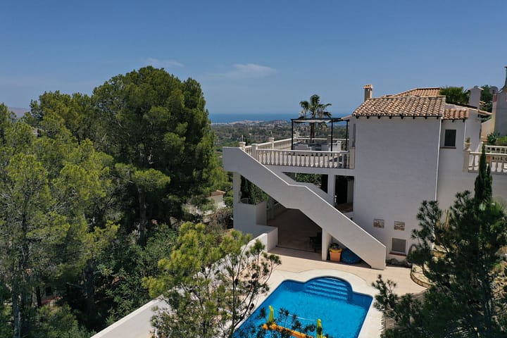 Met privézwembad, twee grote en twee kleinere terrassen, een zonneterras boven, een schaduwterras beneden en met de mooiste vergezichten kunt u in deze Villa iedere dag vakantie vieren zonder de deur uit te hoeven! Maar dat kan natuurlijk wel. Dankzij de strategische ligging zijn er veel keuzemogelijkheden, van bergwandelingen, stedentrips naar Valencia en Alicante tot het dynamische uitgaansleven van Benidorm. Een eigen Auto is aan te bevelen. De benedenverdieping van dit natuurhuisje heeft drie slaapkamers is zowel direct vanuit de woonkamer als buitenom via het terras en een zijingang bereikbaar. De masterbedroom (met airco) heeft een eigen douche en toilet. De grote badkamer bestaat uit een inloopdouche, toilet en ligbad en wasmachine. De twee overige slaapkamers (1 met dubbelbed en 1 met 2 enkele bedden) zijn op dezelfde verdieping . Op de onderste verdieping bevindt zich het appartement met 2 pers bed, keuken, badkamer en naast een groot terras het 10×4 m Zwembad