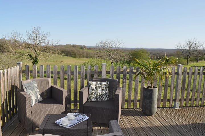 Onze gîte Bellevue is een knus en comfortabel vakantiehuisje in het hart van de Dordogne. Het huisje heeft 36 m2 binnenruimte en een (deels overdekte) veranda van nog eens 36m2! Met het fantastische vrije uitzicht rondom is het heerlijk vertoeven op 1 van de loungestoelen. Met haar 2 slaapkamers, een woonkamer met volledige, open en ingerichte keuken en een badkamer met wastafel, douche en toilet is deze gîte geschikt voor een gezin met maximaal 3 kinderen (stapelbed en ledikant) of met z’n twee voor een heerlijk rustig plekje in de prachtige Périgord. Op de veranda vindt je ook een eettafel met stoelen en een lounge set.