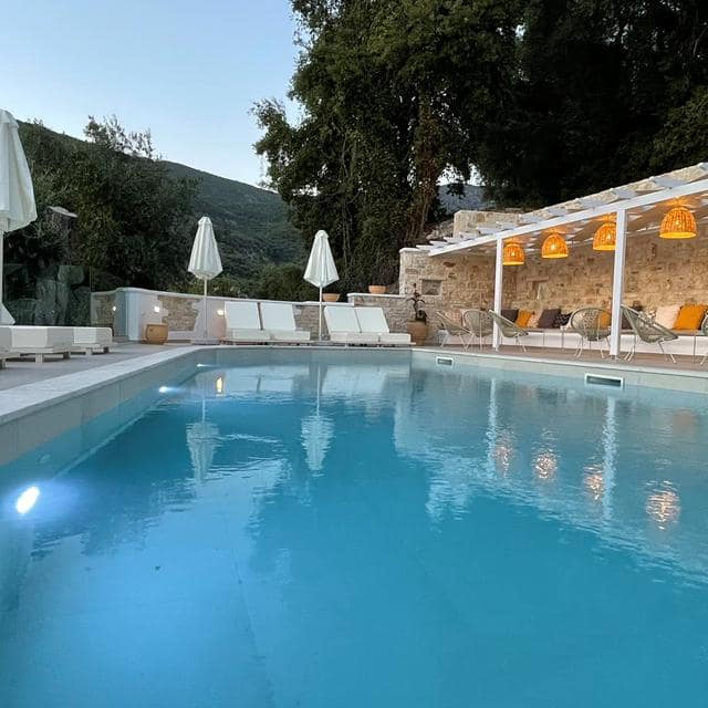Na een warm welkom van gastheer Ahileas, ga ik eerst een kijkje nemen bij het zwembad van de Gallery Suites. Vanwege de bijzondere ligging tegen de groene heuvels van Parga, is het uitzicht hier adembenemend mooi!