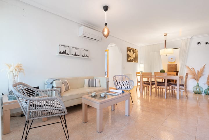 De flat is gelegen in een mooie urbanisatie met prachtige tuinen en een gemeenschappelijk chloorzwembad. Het zwembad meet 25 x 10 meter, heeft een diepte variërend van 0,9 tot 1,20 meter en beschikt over een 0,50 meter diep gedeelte waar de jongste leden van het gezin kunnen afkoelen. Naast het zwembad is er niets beters dan ontspannen in de gemeenschappelijke jacuzzi (alleen koud water). Eenmaal in de flat biedt het huis u een grote gemeubileerde tuin waar u heerlijk een boek kunt lezen, een aperitief kunt nuttigen of kunt genieten van een heerlijke barbecue met uw familie of vrienden.