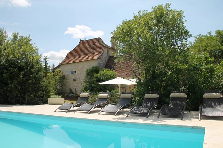 Op onze berg (330m) aan de Vallee du Lot (het Toscane van Frankrijk), kunt u een heerlijke vakantie doorbrengen in deze stijlvolle natuurstenen campagnewoning met fenomenale uitzichten rondom. Het huis stamt uit 1830 en is met behoud van vele authentieke elementen (oude broodoven, oude éviers, grote open haarden) gerenoveerd tot een comfortabele, compleet ingerichte en zeer sfeervolle woning voor 2 tot 10 personen. De muren zijn 60 tot 80 cm dik, waardoor het ’s zomers prettig koel blijft. En als het uiteindelijk toch te warm mocht worden: het huis is voorzien van een moderne airco installatie/warmtewisselaar, koelte in de zomer, warmte in het koudere seizoen. Karakteristieke ruime woonkamer met plavuizen en balkenplafond en grote open haard. Een ruime keuken, voorzien van alle comfort en uitstekend geoutilleerd (o.a. vaatwasser, oven/magnetron, grote vries/koelkast, senseo, koffiezetapparaat, etc) staat de kookliefhebbers tot beschikking. Uiteraard is er ook een barbeque aanwezig. Een van de vier slaapkamers is uitgerust met een originele open vuurplaats en mede door de warme inrichting is dit wel een heel romantisch plekje: inslapen in middeleeuwse sferen en ’s morgens gewekt worden door de streling van de Franse zon die door de halfgeloken luiken naar binnen schijnt! Uw privé zwembad met natuurstenen terras (geen hete tegels door de zon!) staat voor een verfrissende duik (van juni tot september) tot uw beschikking. Even weg uit het jachtige dagelijkse leven en terugkeren naar een zeldzame, haast onwerkelijke rust en stilte midden in de natuur met behoud van alle comfort!