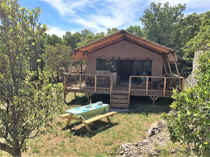 YUCCA LODGE ligt samen met 6 andere accomodaties ruim verspreid over een mediterraan park van ongeveer 3 hectaren. Ieder verblijf heeft een unieke en intieme ligging door de diverse niveauverschillen die het terrein karakteriseert en is omringd door een mooie tuin. De lodge is gebouwd op 1m hoogte en heeft een overdekt terras met een mooi uitzicht. De voorzijde van de tent kan over de hele breedte open wat het kampeer gevoel extra versterkt maar dan wel met alle comfort.