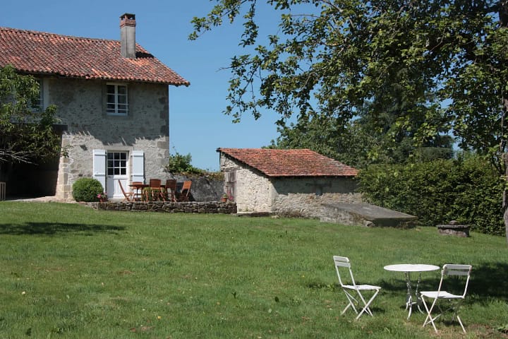 Aan de achterkant van de gite is een omheinde tuin, waar meerdere auto’s kunnen worden geparkeerd. Het terras aan de voorkant van het huis is perfect geschikt om ’s avonds buiten te eten.