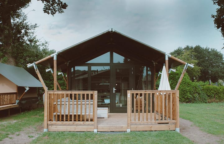 Safarichalet voor 4 personen met een badkamer en aparte kindersafaritent.