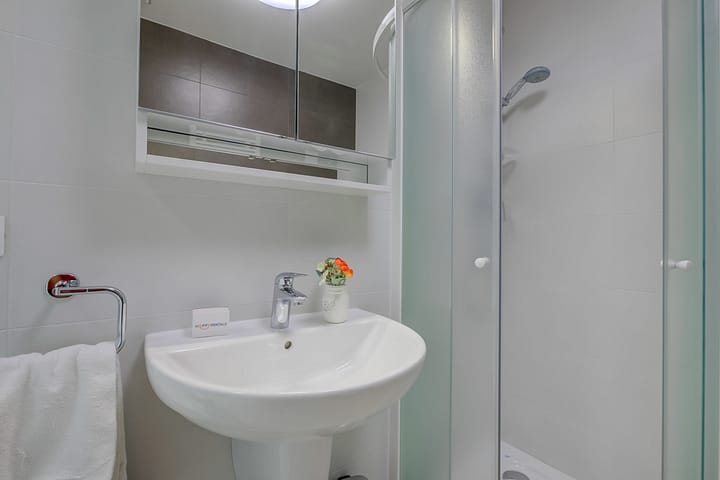 Het perfecte vakantieoord om te ontsnappen met uw gezin of een geliefde. Het pand beschikt over een groot terras dat toegankelijk is via kamerhoge glazen deuren vanuit zowel de hoofdslaapkamer als de woonkamer. Het terras biedt uitzicht over het gemeenschappelijke zwembad, de stad en de zee daarachter. Als verlengstuk van de interne leefruimte kunnen gasten ontspannen in de comfortabele zithoek onder een schaduwrijke parasol, het ideale alternatief voor een informeel diner of een drankje aan het eind van een drukke dag.