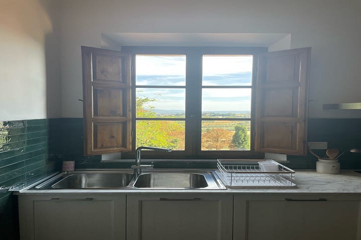 Het appartement is vol karakter met balkenplafonds en terracotta tegelvloeren. De woonkamer is ingericht met traditionele antieke stukken die de geschiedenis van de omgeving weerspiegelen. Er is een bank, een flatscreen-tv en een elegante antieke kist. In de aparte keuken/eetkamer vinden de gasten nieuw ingerichte keukenunits met een kookplaat, oven, koelkast/vriezer en een koffiezetapparaat. De rustieke eettafel biedt plaats aan 6 personen.