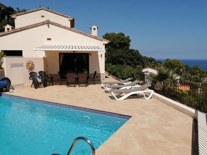 Het huis is geschikt voor zes personen en beschikt over drie 2-persoons slaapkamers en twee badkamers. Na parkeren op de eigen parkeerplek gaat u via een trap met mooie Spaanse tegels naar de voordeur. Binnengekomen bent u op de verdieping waar geleefd wordt. Hier bevinden zich de woonkamer en keuken en heeft u direct op hetzelfde niveau toegang tot het terras met privé zwembad en zeezicht.