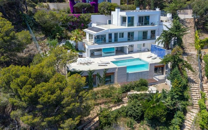 Het interieur van de woning geniet van uitzonderlijke lichtinval, dankzij de grote ramen. De woning bestaat uit vier verdiepingen. U komt binnen op de bovenste verdieping, waar u beschikt over een spectaculaire woonkamer, zeer ruim en licht en met een fantastisch uitzicht op de Middellandse Zee. Vanuit de woonkamer komt u op een groot terras, waar u de hele dag kunt ontspannen als u wilt. Op de verdieping hieronder bevinden zich vijf slaapkamers:- Suite 1: Een 2-persoonskamer met badkamer met douche en suite en een hoek terras;- Suite 2: Een 2-persoonskamer met badkamer met douche en suite en een terras;- Suite 3: Een 2-persoonskamer met badkamer met douche en suite en een terras;- Suite 4: Een 2-persoonskamer met badkamer met douche en suite en een terras;- Suite 5: Een mastersuite met 2-persoonsbed, een hoekterras en een badkamer die is geïntegreerd in de rotsen en beschikt over een losstaand bad en een douche.Alle kamers hebben uitzicht op zee, airconditioning en een televisie.Ook op deze verdieping is nog een badkamer en een waskamer met twee wasmachines en een droger.Weer een verdieping lager komt u bij het prachtige zwembad. Hier is ook weer een badkamer/wc en een grote keuken met kookeiland en toegang tot het zwembadgedeelte en de barbecue hoek. Uiteraard weer met een geweldig zeezicht. Tenslotte op de onderste verdieping vinden we de fitnessruimte met een badkamer, en kunt u onderwater in het zwembad kijken. Vanuit deze ruimte komt u ook bij de twee laaste suites:- Suite 6: Een 2-persoonskamer met douche en zeezicht- Suite 7: Een 2-persoonskamer met douche en zeezicht. Het hele huis is voorzien van WIFI en airconditioning en er is een lift aanwezig. Bij de huur is per dag 5 uur schoonmaak inbegrepen, van maandag t/m zaterdag. Zwembad