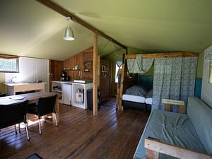 Comfortabel kamperen in luxe ingerichte tent gelegen in het bos De leefruimte van deze ingericht tent is ruimer dan het type Luxe, en bestaat uit een zithoek met tv en een...