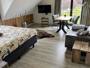 Riante B&B kamer met fijn ontbijt en prima faciliteiten De kamer is voorzien van 1 tweepersoons boxspringbed en een zitje met smart-tv. De badkamer heeft een douche en toilet.