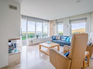 Luxe hoekappartement met zicht op De Koog en Noordzee Luxe hoek appartement op de begane grond met riant terras op het zuiden. Entree, riante woonkamer met zithoek en smart...