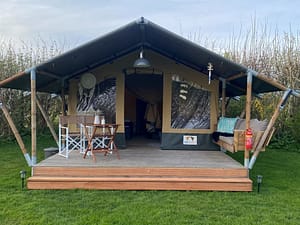 Ruime compleet ingerichte safaritent met veranda De safaritenten staan op het eerste campingveld. De tent is ingericht voor maximaal 4 personen. Er zijn 2 afsluitbare...