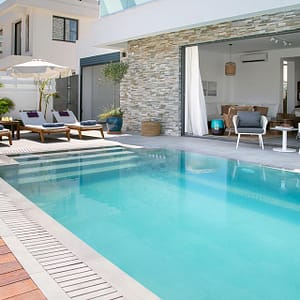 De ochtend begin ik graag met een frisse duik en hoe heerlijk is het dat ik bij mijn verblijf Chris Le Mare Gold Luxury Villa zo in mijn privézwembad kan plonzen....