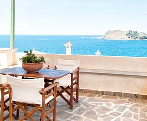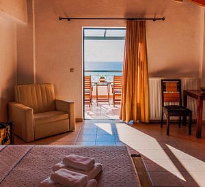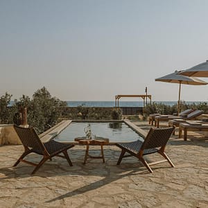 Vanaf het balkon van de Pnoes Suites staar ik in de verte. De zon verwarmt mijn gezicht, terwijl ik uitkijk over wonderschone natuur met in de verte de Golf van Toroneos. Ik...