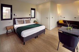 De luxe 2-persoons hotelstudio met mooi terras, hoge ramen en een schuifpui, biedt verrassend veel privacy, ruimte en comfort Hotelstudio AmaliaLuxe 2-persoons hotelstudioDe luxe...