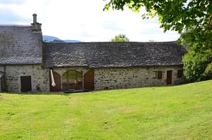 Vrijstaand natuurstenen huisje, in de voortuin van Château de Tautal Bas. Woonkamer met open keuken en een deur op het terras, met een wijds uitzicht over de vallei van de Sumene...