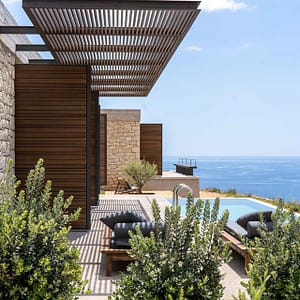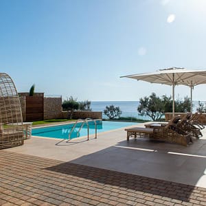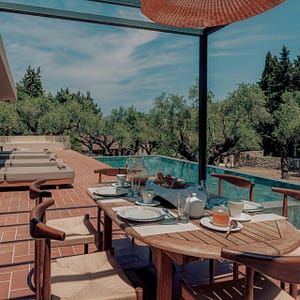 Ik zit op het terras bij Agorastos Luxury Living. Voor me zie ik een prachtig zwembad met fijne ligbedden en olijfbomen. Kijk ik de andere kant op, dan zie ik het knusse...