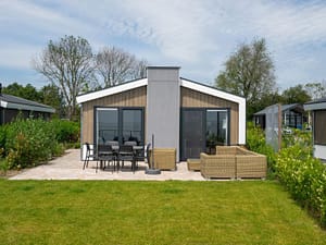 "Pavilion Waterfront 6", chalet 4-kamers 75 m2. Comfortabel ingericht: hal met aparte WC. Woon-/eetkamer met eettafel en Flatscreen TV. Uitgang naar het terras. 1 2-pers. kamer...