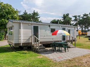 "Kattenbos", 3-kamers mobilhome. Doelmatig ingericht: woon-/eetkamer met eettafel en TV. Uitgang naar het terras. 1 2-pers. kamer met 1 2-pers bed. 1 2-pers. kamer met 2 bedden....