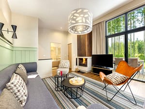 "Cottage VIP", huis in een rij 3-kamers 69 m2. Licht, zeer comfortabel ingericht: woon-/eetkamer met open haard, eettafel en TV (Flatscreen TV). Uitgang naar het terras. 1 kamer...