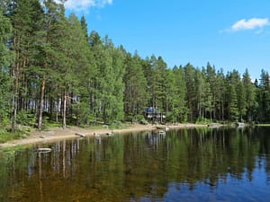 "Älgnäs (HSL040)", huis 3-kamers 32 m2. Eenvoudig ingericht: woon-/eetkamer met open haard, eettafel en TV. Doorgangskamer met 1 2-pers bed (1 x 160 cm). 1 kamer met 2 bedden....