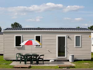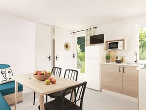 "6 persoons", 4-kamers mobilhome 32 m2. Comfortabel ingericht: woon-/eetkamer met eettafel en Flatscreen TV. Uitgang naar het terras. 1 2-pers. kamer met 1 2-pers bed. 2 2-pers....