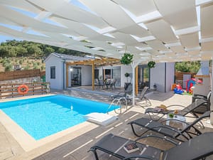 "Eleonas", villa 4-kamers 100 m2. Licht, zeer comfortabel ingericht: groot woon-/eetkamer met 1 divanbed en Sat-TV (Flatscreen TV), CD-speler en air-conditioning. Uitgang naar de...